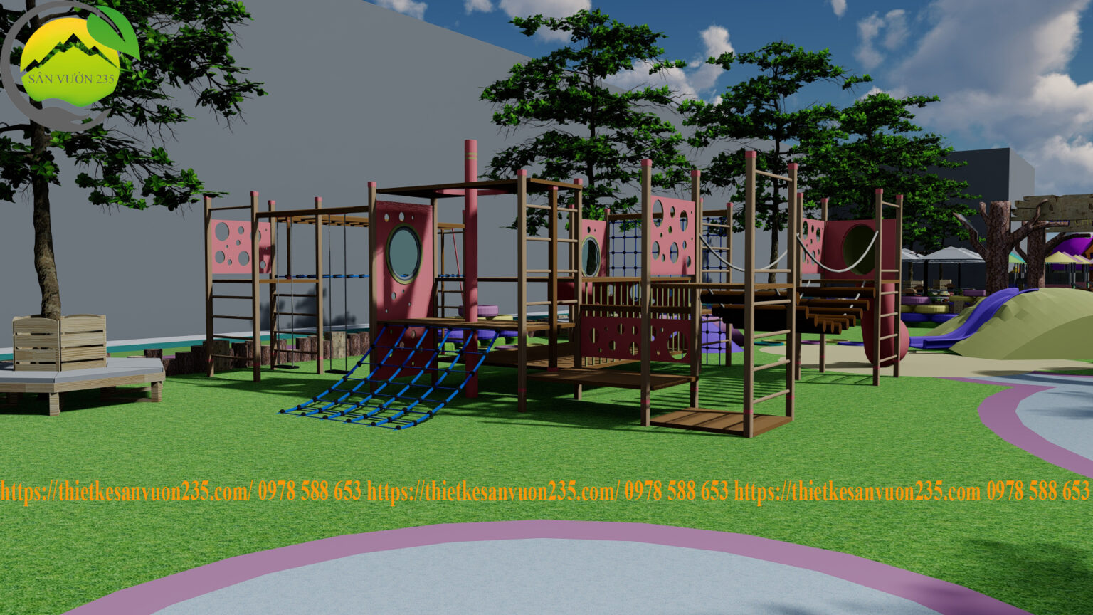 Thiết kế cảnh quan phong phú với sự kết hợp của cây cối, hoa lá và các khu vực vui chơi sáng tạo